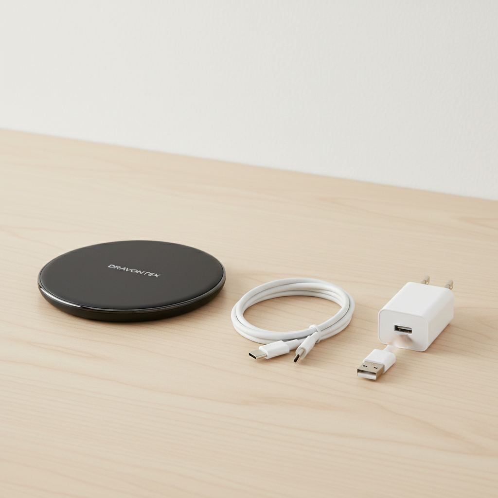 1 x Dravontex Aura Wireless Charging Pad, 1 x 3.3ft USB-C to USB-A Cable, 1 x User Manual